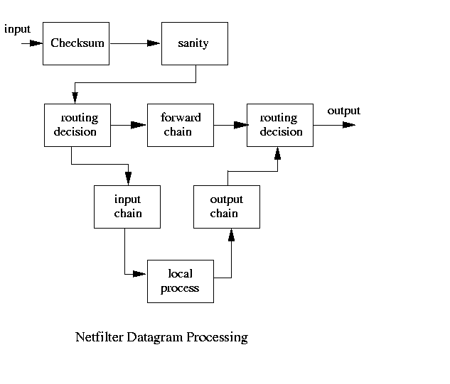 The process begins when any IP packet arrives in the system as Input, it has to undergo some error checking, a Checksum test and a Sanity test, and then it becomes part of the input chain. For the time being, ignore the Routing Decision blocks. From the input chain, a decision is made: does this packet belong here or should it be forwarded to another host. If the answer is the former, it is sent to the local process otherwise it is sent to the forward chain. A packet that is generated internally to the host, or which comes from the forward chain is processed by the output chain.