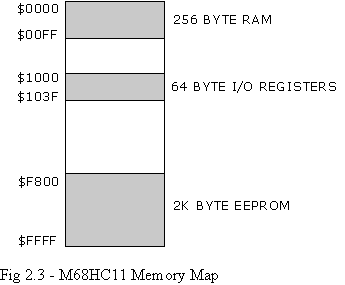 The memory map shows that the 256 bytes of SRAM reside from address $0000 to $00FF. This block of read/write memory will be used to store our variables as well as the stack. Our program code will be stored in 2K bytes of EEPROM starting at address $F800. The Input/Output features of the HC11 are accessible as a 64-byte block of memory with addresses from $1000 to $103F.
