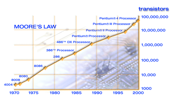 Gordon Moore made his famous observation in 1965, just four years after the first planar integrated circuit was discovered. The press called it "Moore's Law" and the name has stuck. In his original paper, Moore predicted that the number of transistors per integrated circuit would double every 18 months. He forecast that this trend would continue through 1975. Through Intel's technology, Moore's Law has been maintained for far longer, and still holds true as we enter the new century. The mission of Intel's technology development team is to continue to break down barriers to Moore's Law.