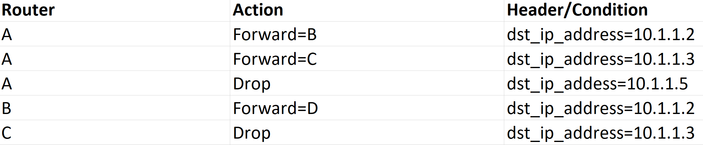 Router A gets 3 rules. If router A ever receives a packet that has a destination IP address of 10.1.1.2, it will always forward it to Router B. If a packet ever arrives with a destination IP address of 10.1.1.3, it will always forward it to router C. If router A gets a packet with a destination IP address of 10.1.1.5, it will drop the packet and move onto the next packet in the queue.
