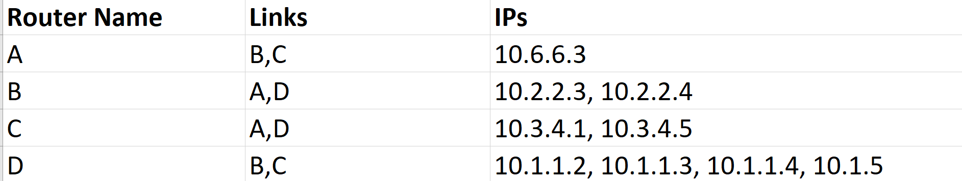 | You have a router class/struct that contains information about the router number, ip addresses, and links |