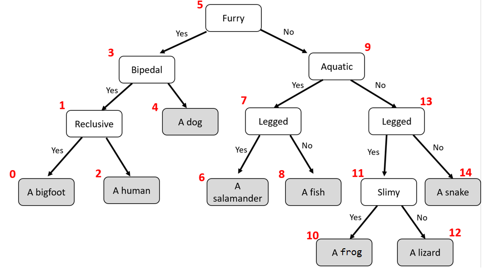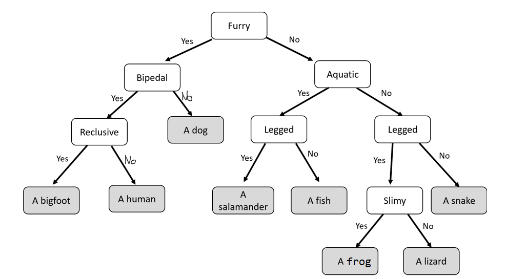 You can imagine representing these characteristics in a tree-like structure where internal nodes are characteristics (furry, bipedal, gilled) and leaf nodes are animals (dog, human, fish). Because each characteristic can be answered with “yes” or “no”, we can represent this classification system as a binary tree (each internal node has two children).