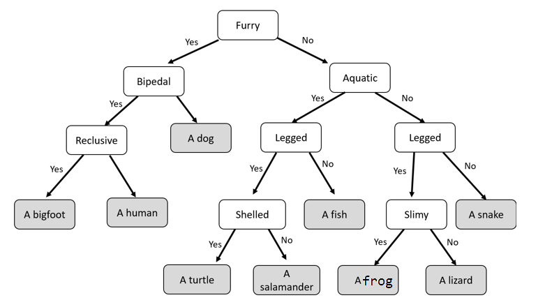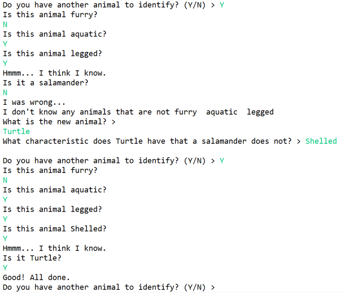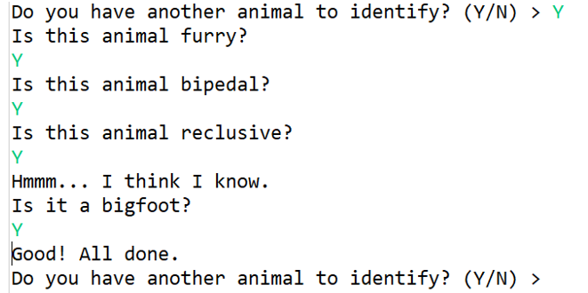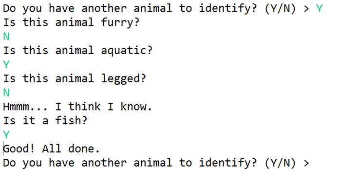 Animals can be classified by their characteristics (it is in the water, it doesn’t have legs, it has gills, it is a fish, etc). The user will answer a series of yes or no questions, until the program is ready to make a guess. If the programs correctly guesses the animal, the program will loop and ask if they want to identify another animal, and the process is repeated.