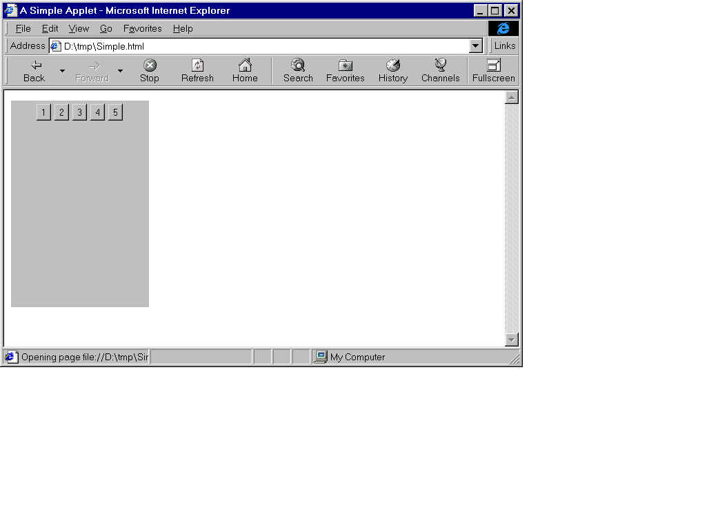 To display a component on the window, call the method "add". Example In the code below, five buttons (with labels "1", "2", "3", "4", and "5") are created and displayed on the window with the FlowLayout manager. Run this applet and experiment with the size of the drawing area to better understand how the flow manager works. Remember that this code should be stored in a file called Flow.java! import java.awt.*; import java.applet.*; public class Flow extends Applet