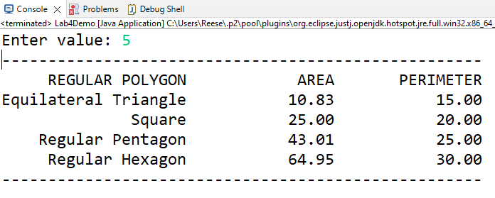Use Lab3Demo.Java to test your code. The user inputs a side length (ie 5) when the program starts, and then the Lab3Demo class uses the classes that you define to compute the perimeter and area of a Triangle, Square, pentagon, and hexagon given the side length (remember that these are all regular polygons). The RegularPolygon interface gives us a consistent way to treat all the different types of regular polygons there could be, even though they’re all a bit different under the hood. A RegularPolygon can take many forms; that’s polymorphism!