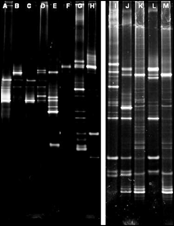 Information on wound types and culture results for the above DGGE gels are presented in Table 1. In one case, (A) no microorganisms were cultured, but a distinct band was apparent after PCR and DGGE of extracted DNA from the chronic wound sample. In many cases, one to three organisms were cultured from the wound samples but many bands are present in the DGGE analysis indicating that multiple species were present. These findings underscore the utility of molecular methods for detecting unculturable microorganisms. These preliminary studies also suggest that the samples from the diabetic foot ulcers had the most species diversity (i.e. bands) and venous leg ulcers had the least species diversity. However, a detailed analysis of more samples will be necessary to confirm this suspicion.