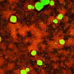 This article began with the statement that much of what makes life in a biofilm special can be explained by accounting for diffusive phenomena. Diffusion limitation probably does not explain everything though. It is likely that microorganisms have sensing pathways, which trigger gene expression during biofilm development, and that are independent of diffusion-based concentration gradients. As an approach to this issue, consider the image of an antimicrobial-treated biofilm in Figure 4-9. This specimen shows surviving bacteria (green) in the core of mushroom-shaped clusters that sit above a thin base film of killed (red) cells. Why are the survivors concentrated in the interior of cell clusters?