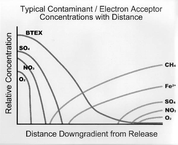 A cross-sectional diagram of the concentrations of contaminant, electron acceptors, and products drawn along the length of the plume typically indicates decreasing contaminant concentrations down-gradient, with the disappearance of the electron acceptors in the order of energy preference (see Figure II-11).