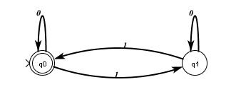 This time let your mouse hover over each of the states briefly. You will notice that a short description pops up that indicates what the state remembers. This description is nothing more than a comment, similar to a comment you would include in a regular program to indicate the state of processing at the point of the comment. So, although we use short names, like q0, to identify states, when designing an FSA to solve a particular problem, we need to keep in mind just what it is that we know about the computation so far at each state. It helps to include comments in the design for this purpose.