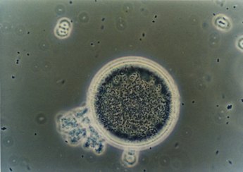 It is fortunate that many microorganisms are capable of metabolizing hydrocarbons. Due to natural and human caused contamination large amounts of hydrocarbons are annually contaminating soil, fresh water and marine environments. Many genera of bacteria including Pseudomonas, Alcaligenes, and Flavobacterium are capable of mineralizing oil and other HCs to carbon dioxide and water. This image shows a population of bacteria actively degrading a droplet of oil suspended in water.