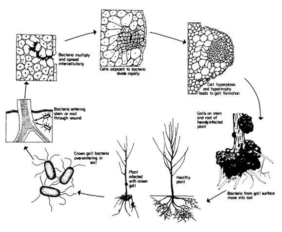 A Crown Gall infection begins with the motile agrobacteria invading the plant, usually through a wound in the root or stalk of the plant, often near the soil level. A plasmid which bears genes which cause a plant growth hormonal imbalance in the plant resulting in the proliferation of cells causing formation of a gall. Other Ti genes induce the plant cells to produce nutrients which are utilized by the Agrobacterium bacterioids.