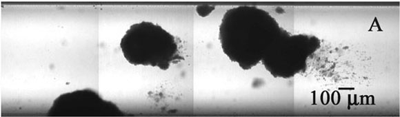 The experimental system for growing the biofilm is a flow cell (Figure 2). This flow cell is just a glass tube that has a square cross section. A microscope objective can be brought down to the flat top wall of the tube and, using confocal scanning laser microscopy, one can image cell clusters clinging to the ceiling of the capillary. In transmission mode microscopy (Figure 3), large, dense clusters of staphylococci (dark areas) can be seen hanging from the ceiling and side walls of the tube. The capillary is approximately 1 mm on each side, so the cell clusters shown here are a few hundred microns in diameter.