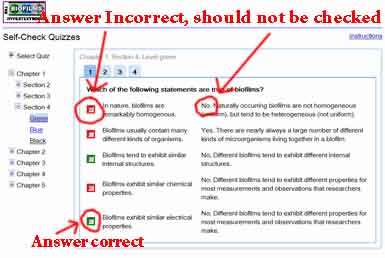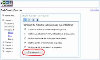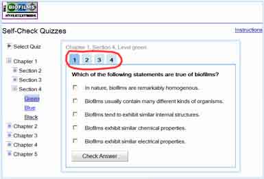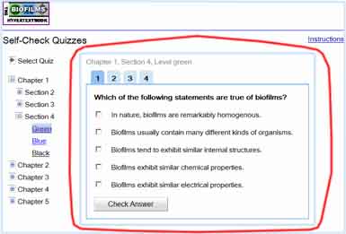 Each self-check quiz corresponds to a specific chapter, section, and level of the Biofilm Hypertextbook